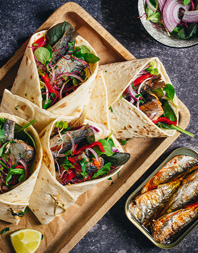 Étape 5Garnir chaque tortilla avec du mesclun ou de la roquette, 1 sardine HOT FISH, un peu de sa sauce, quelques lanières de poivrons et d’oignon et saupoudrer le tout de persil